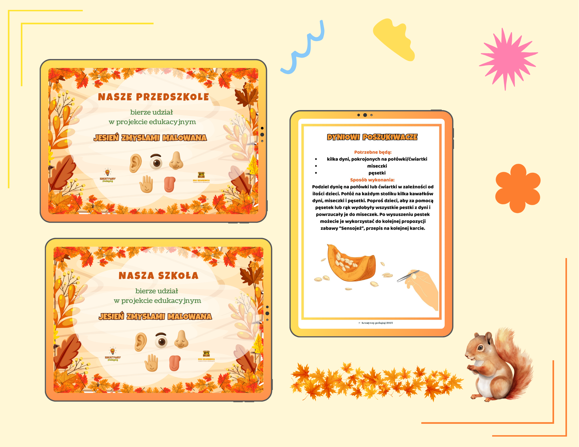 Oddaję w Twoje ręce projekt edukacyjny, który powstał z myślą o wszechstronnym rozwoju dziecka poprzez jesienne, wielozmysłowe doświadczanie świata.