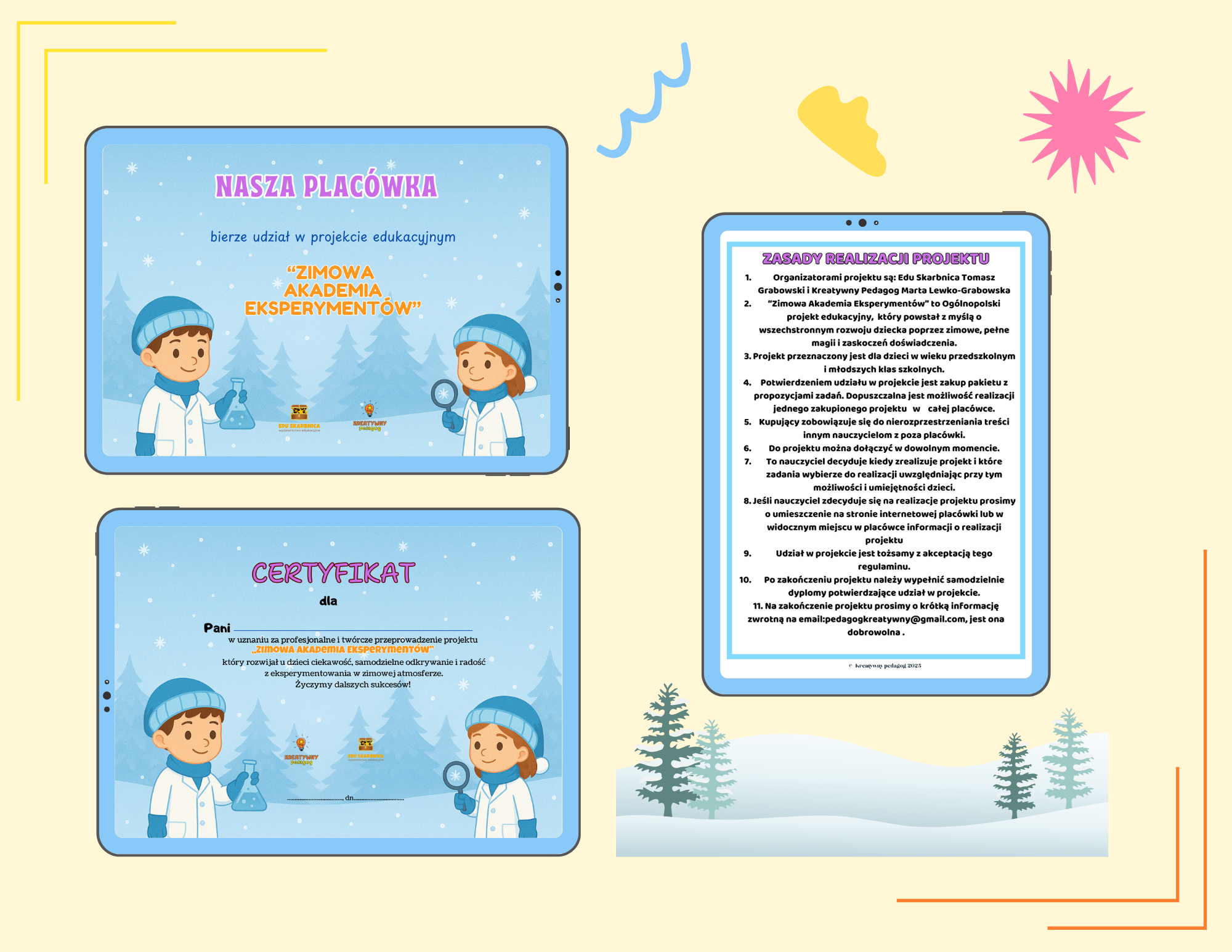 Oddaję w Twoje ręce projekt edukacyjny, który powstał z myślą o wszechstronnym rozwoju dziecka poprzez zimowe, pełne magii i zaskoczeń doświadczenia.